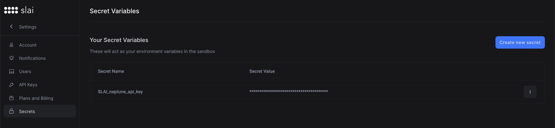 Secrets are managed in the Settings page, under Secrets. To create a new secret, click Create new secret. You’ll be prompted to enter a name and value.