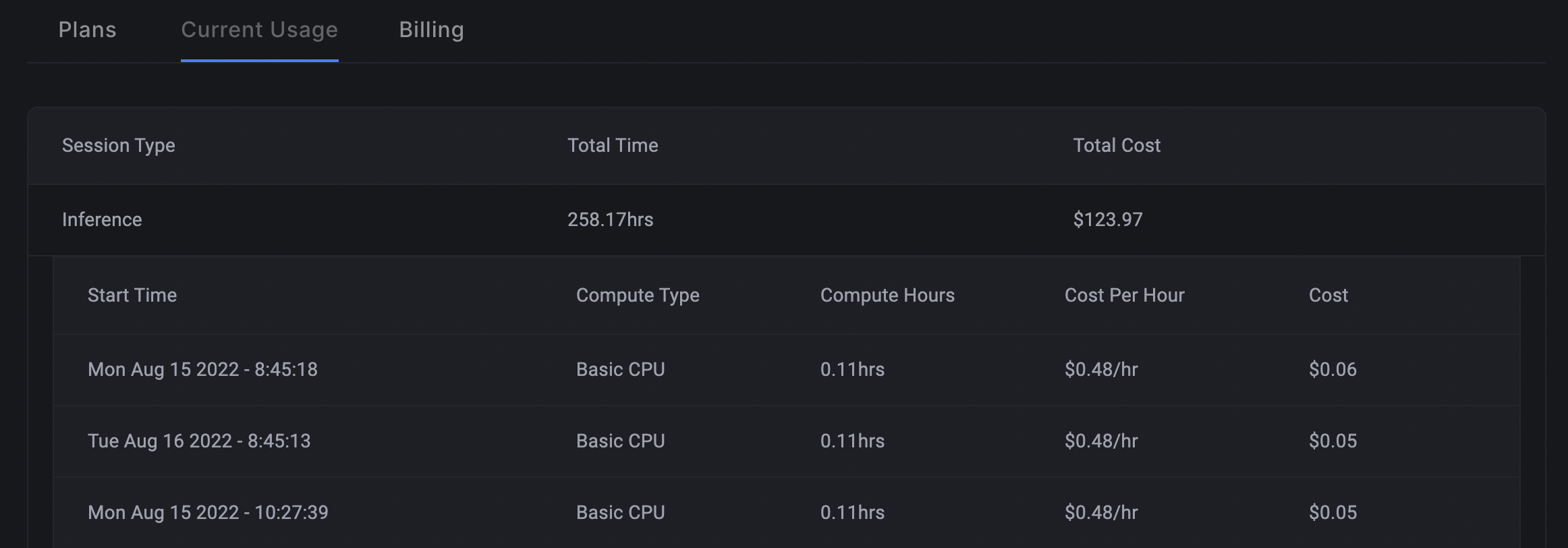 You can view all the compute you’ve consumed for the monthly billing period in the Plans and Billing section of the Settings page.